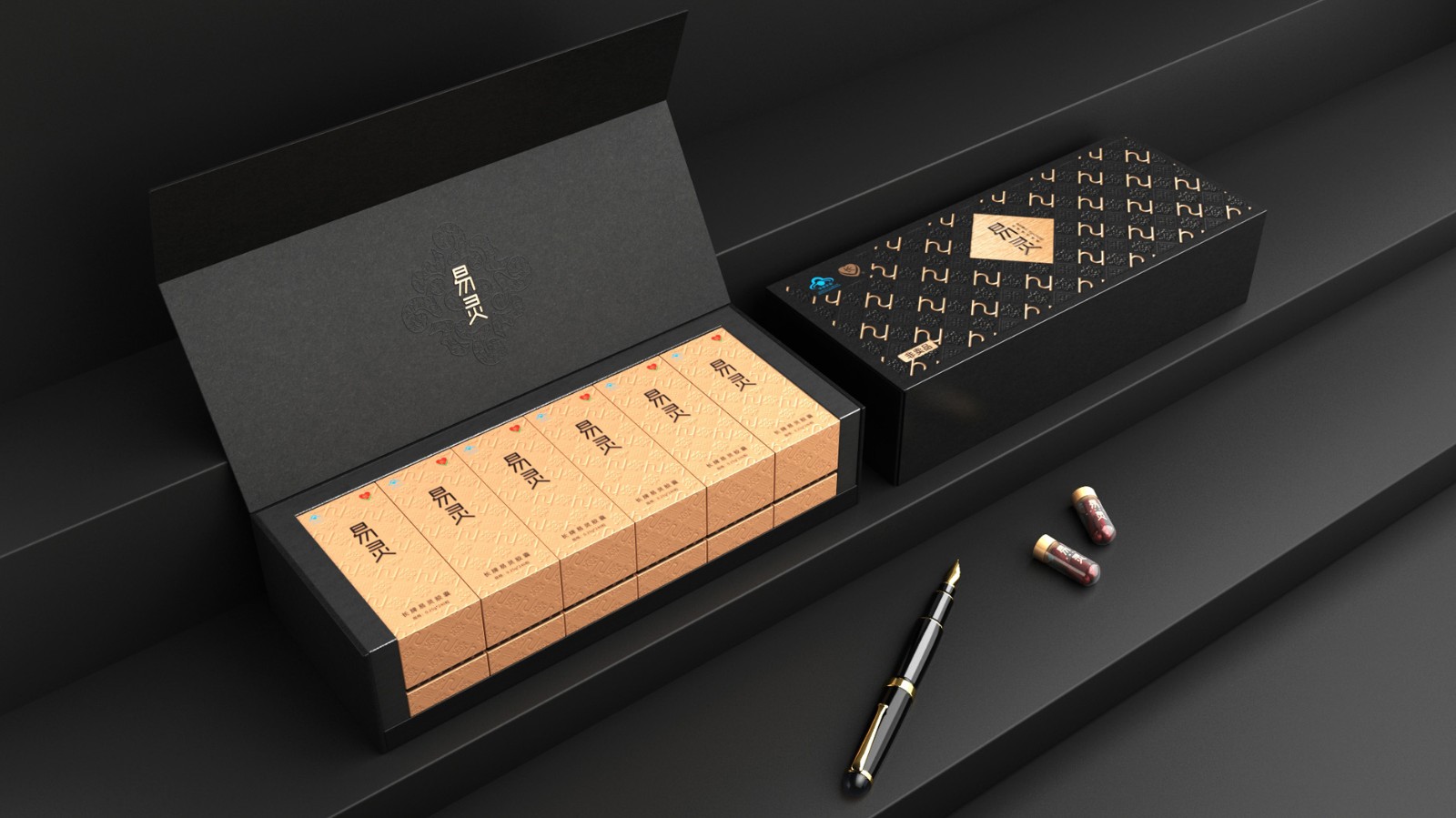 每小盒裝10支小瓶,每小瓶裝四粒,足夠一個(gè)周期的用量,小盒方便用戶攜帶,小盒的排列以彈夾的方式,整齊劃一的鑲嵌在盒中,給客戶以打開的精致感,外盒黑色,小盒金色,給客戶以打開第一眼的沖擊力。