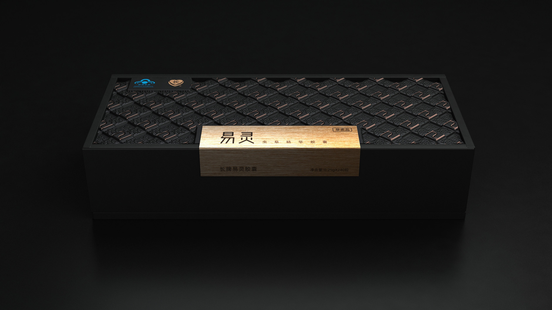 從企業(yè)輔助圖形逐步演化而來,融入了藏飾(蟲草產(chǎn)地)的符號(hào)特征,以重復(fù)構(gòu)成的設(shè)計(jì)方式,使其呈現(xiàn)出奢品氣質(zhì)的秩序美感。利用材質(zhì)質(zhì)感和工藝搭配結(jié)合企業(yè)輔助圖形,挖掘出奢品貴氣的秩序美感,呈現(xiàn)出符合蟲草精華膠囊的品質(zhì)感。