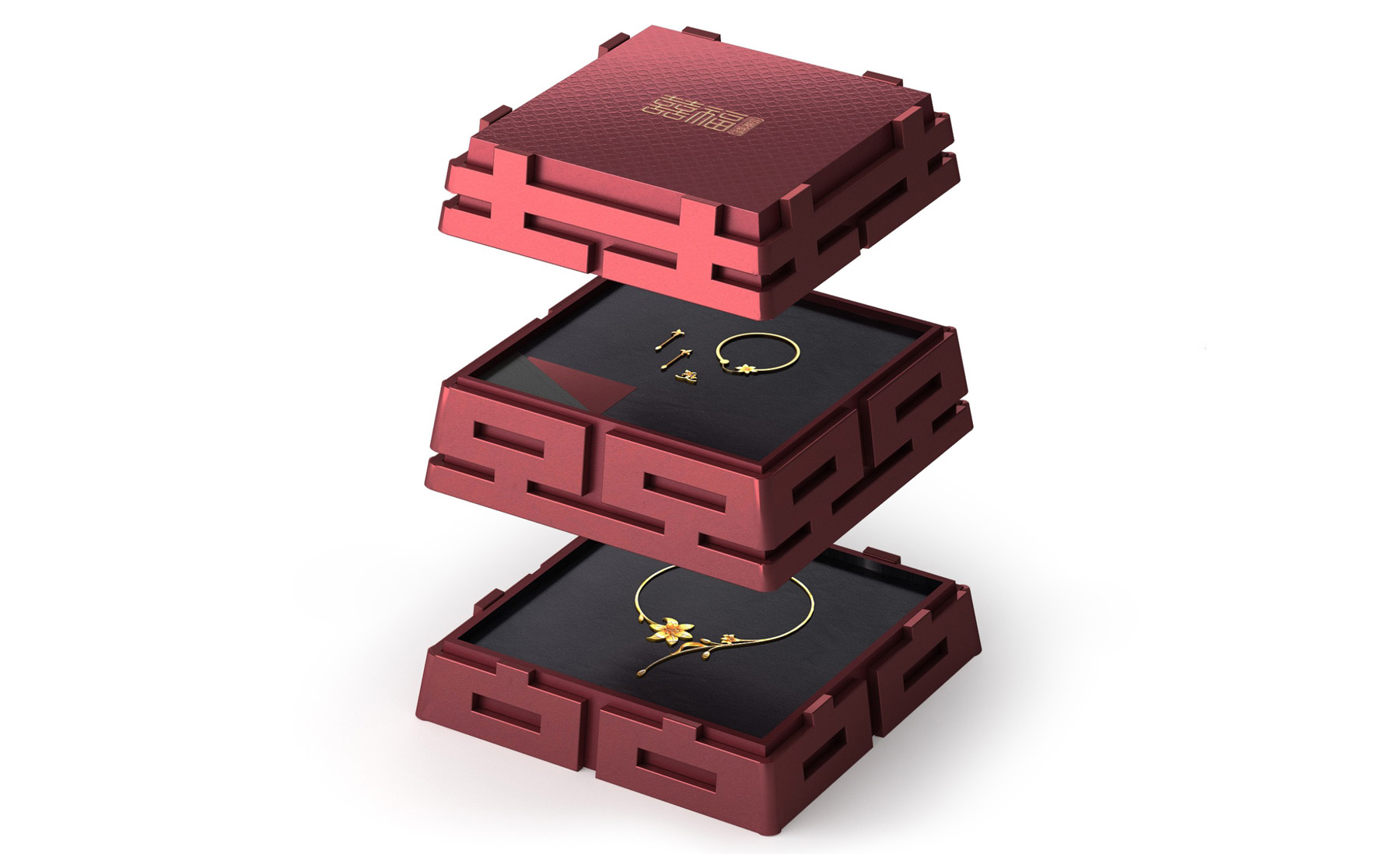 我們發(fā)現(xiàn)“囍”字天生擁有規(guī)則的秩序感,有著可以互相無限連接的特性,隨后將這種連接立體化處理,同時(shí)融入金字塔的結(jié)構(gòu)特征,形成貴重、牢固的、收藏級(jí)的視覺感受。用“囍”字作為主題符號(hào),一眼就明白結(jié)婚專用的金飾,簡單直接,同時(shí)又與品牌名稱完美呼應(yīng),雕塑般的分量感,自帶氣場(chǎng),使產(chǎn)品具有了紀(jì)念意義和收藏價(jià)值!