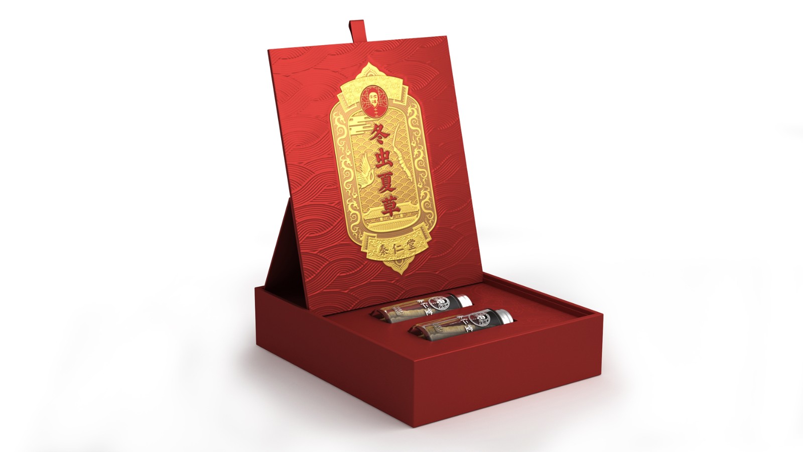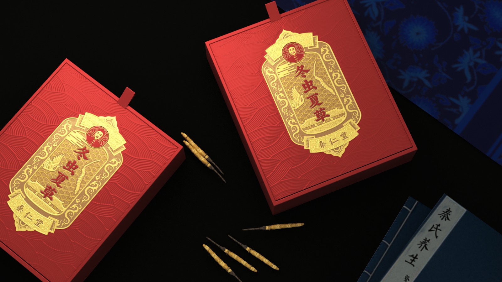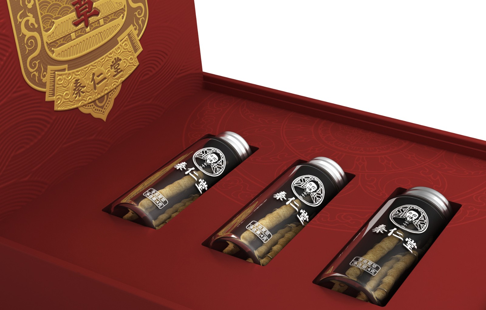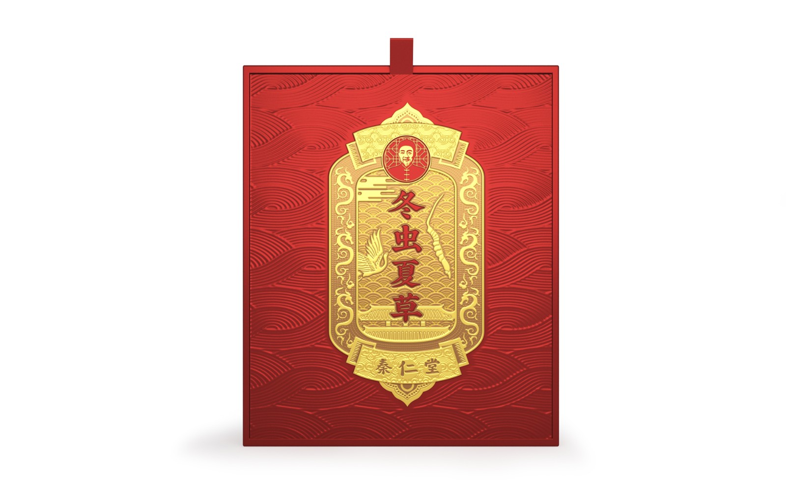 把代表中華文化的龍、底紋、祥云、建筑等元素,融合在主題的金色令牌上,強烈的厚重和信賴感。令牌上又加入鹿、仙鶴和蟲草,在中華文化的基礎(chǔ)上融合養(yǎng)生的意境,更好地體現(xiàn)傳統(tǒng)中醫(yī)藥養(yǎng)生文化,配色上采用紅、金搭配彰顯中華本色。
